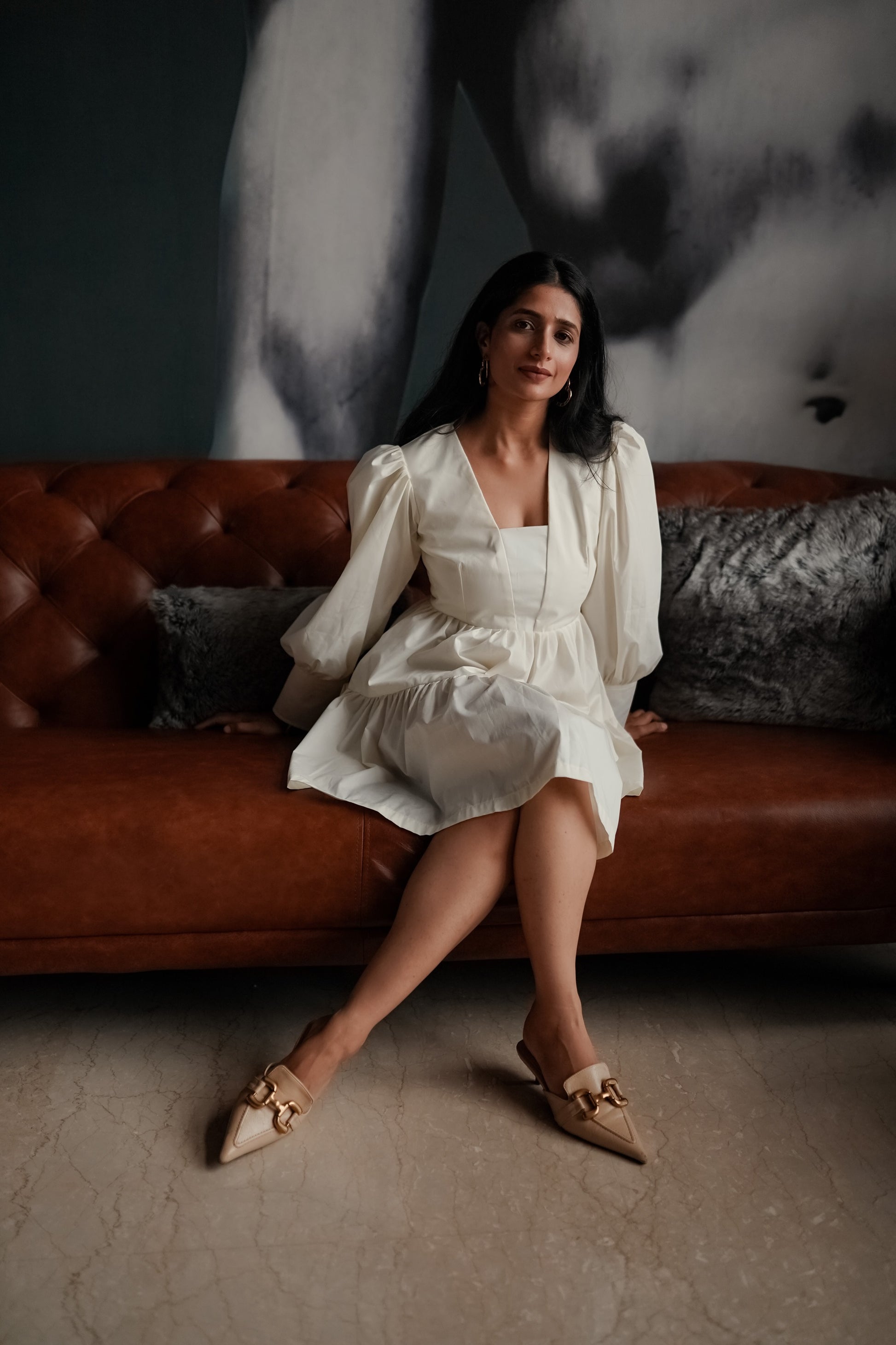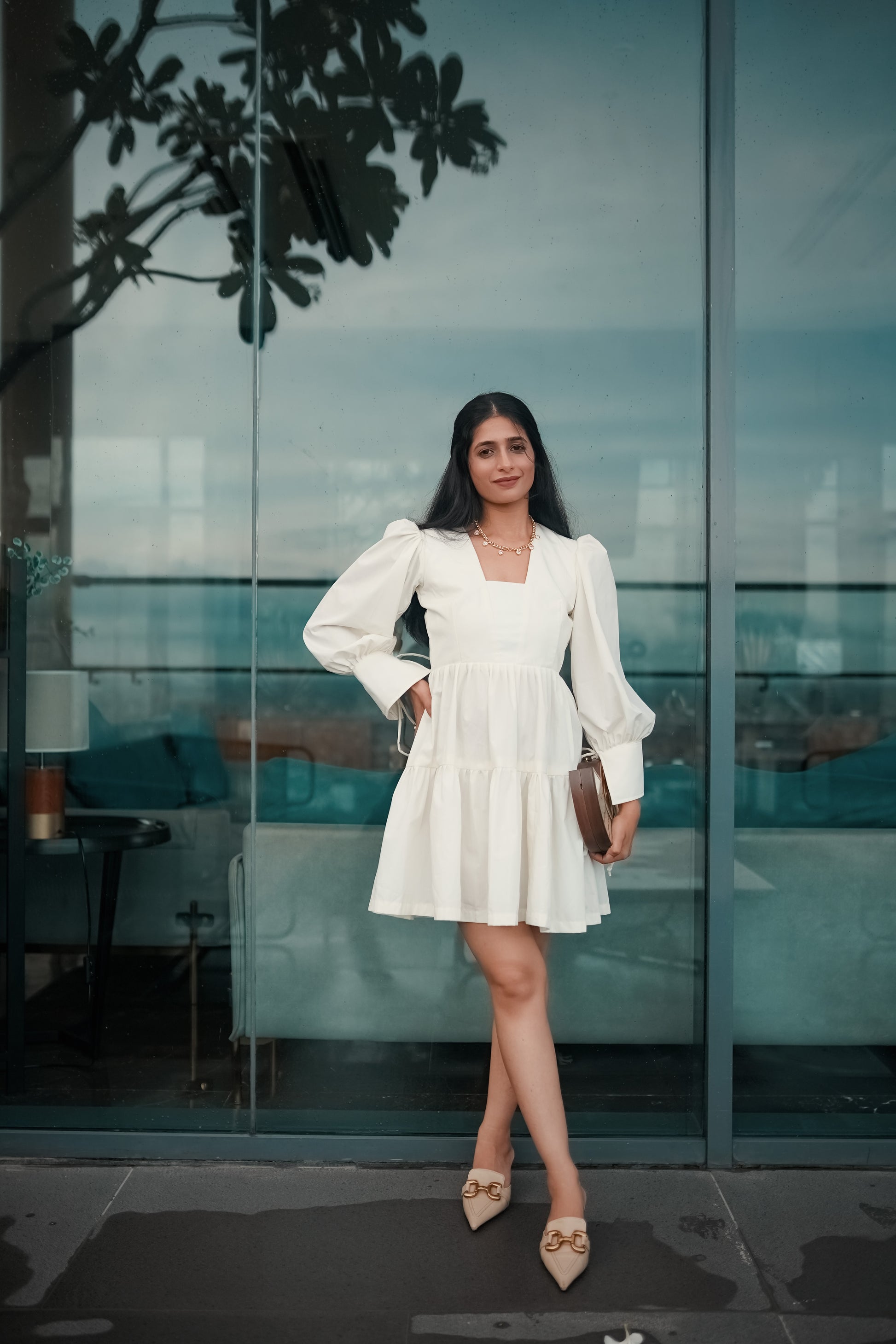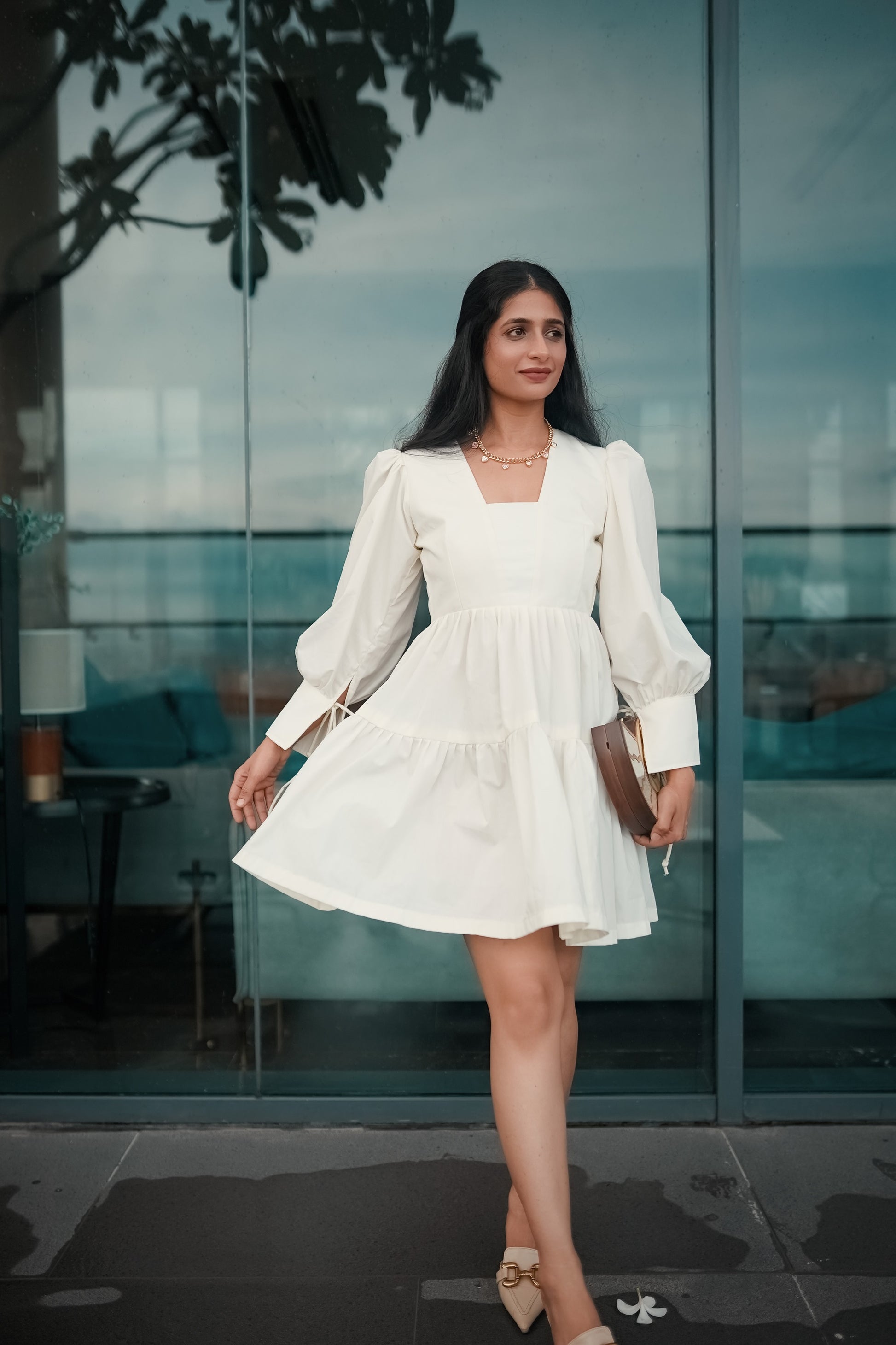 Cotton short dress with balloon sleeves, cuffs and string detailing