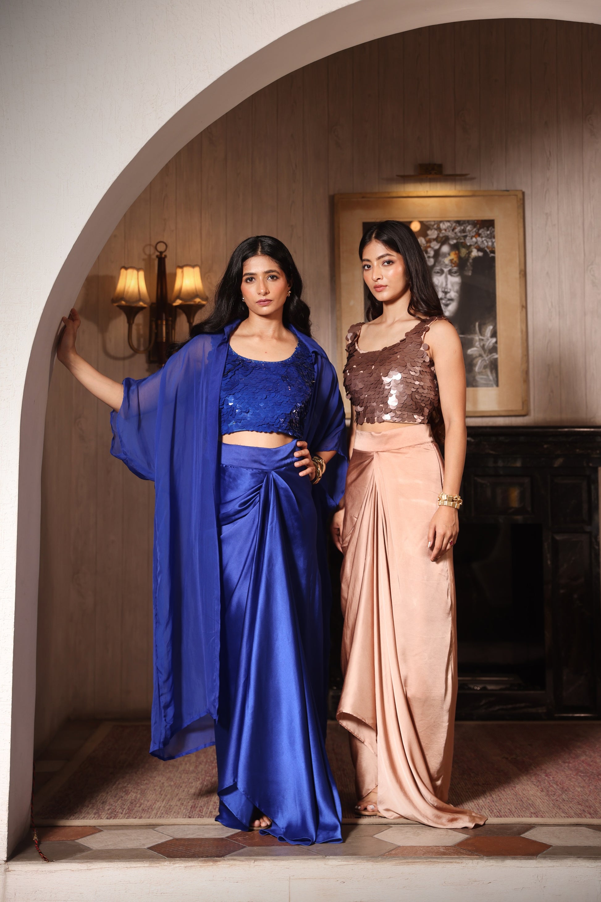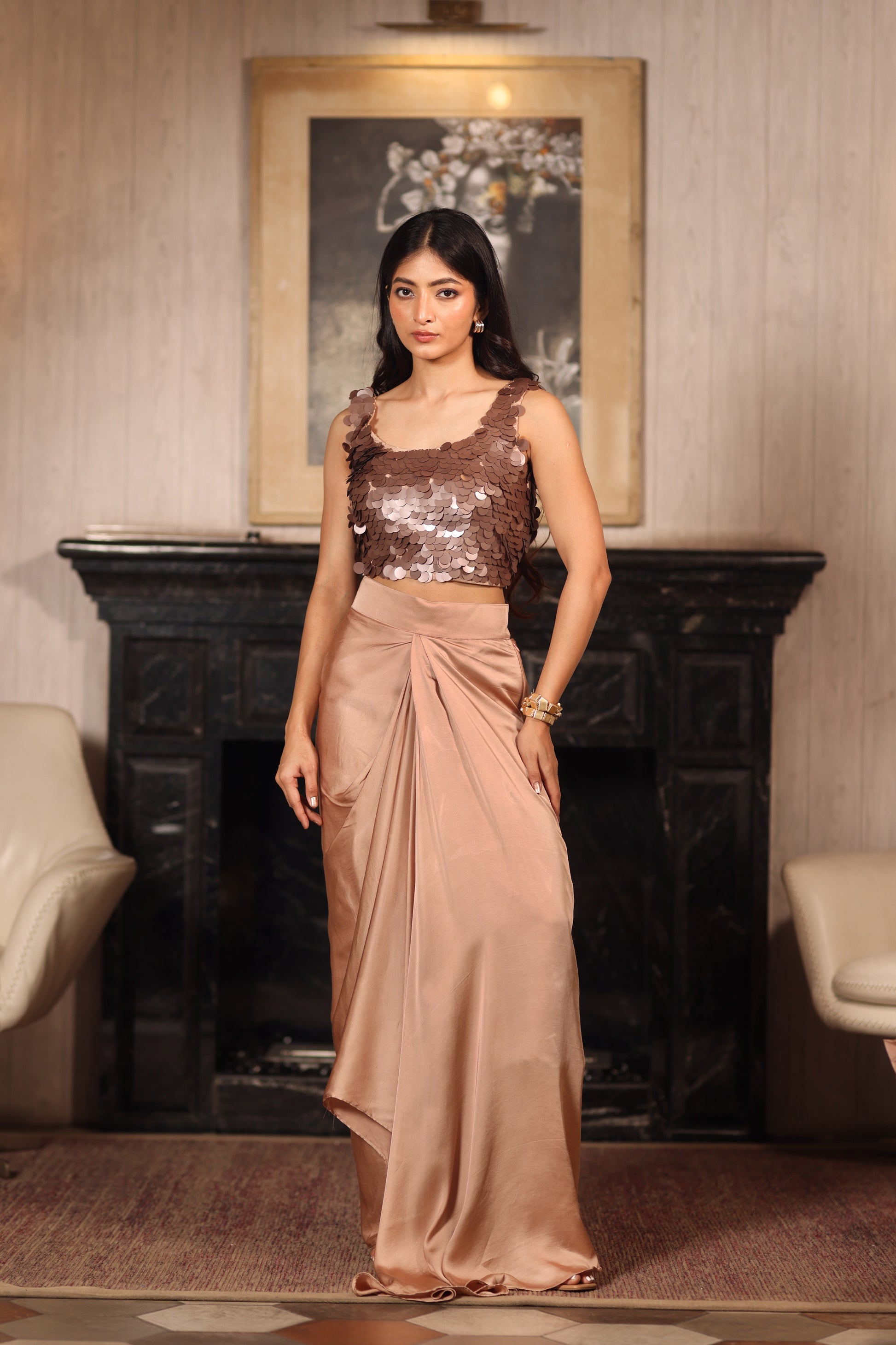 • Dramatic drape + shimmer combo makes it a statement outfit