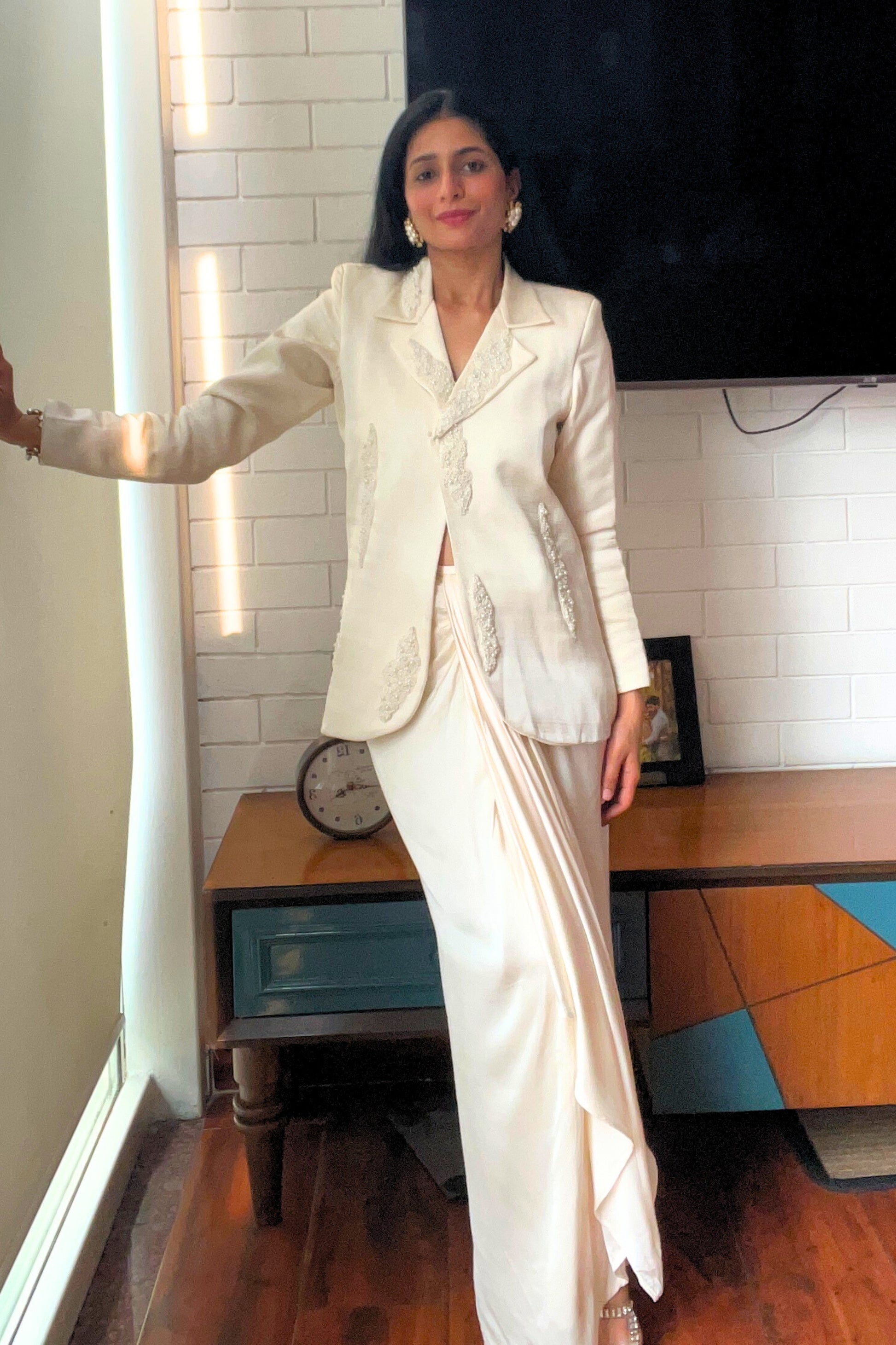 An outfit that speaks glam in the softest tone – tailored for the bold, embroidered for the refined.