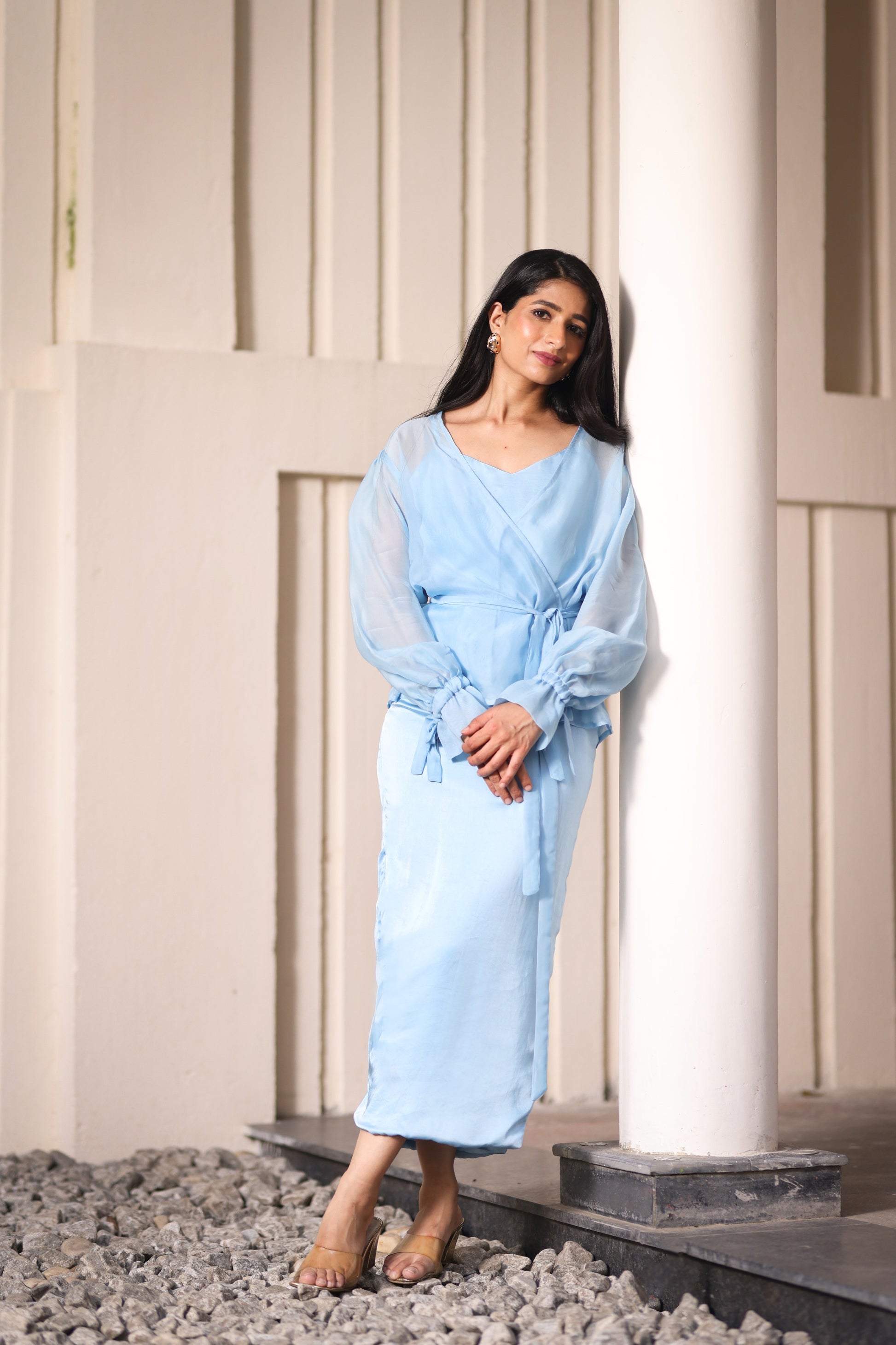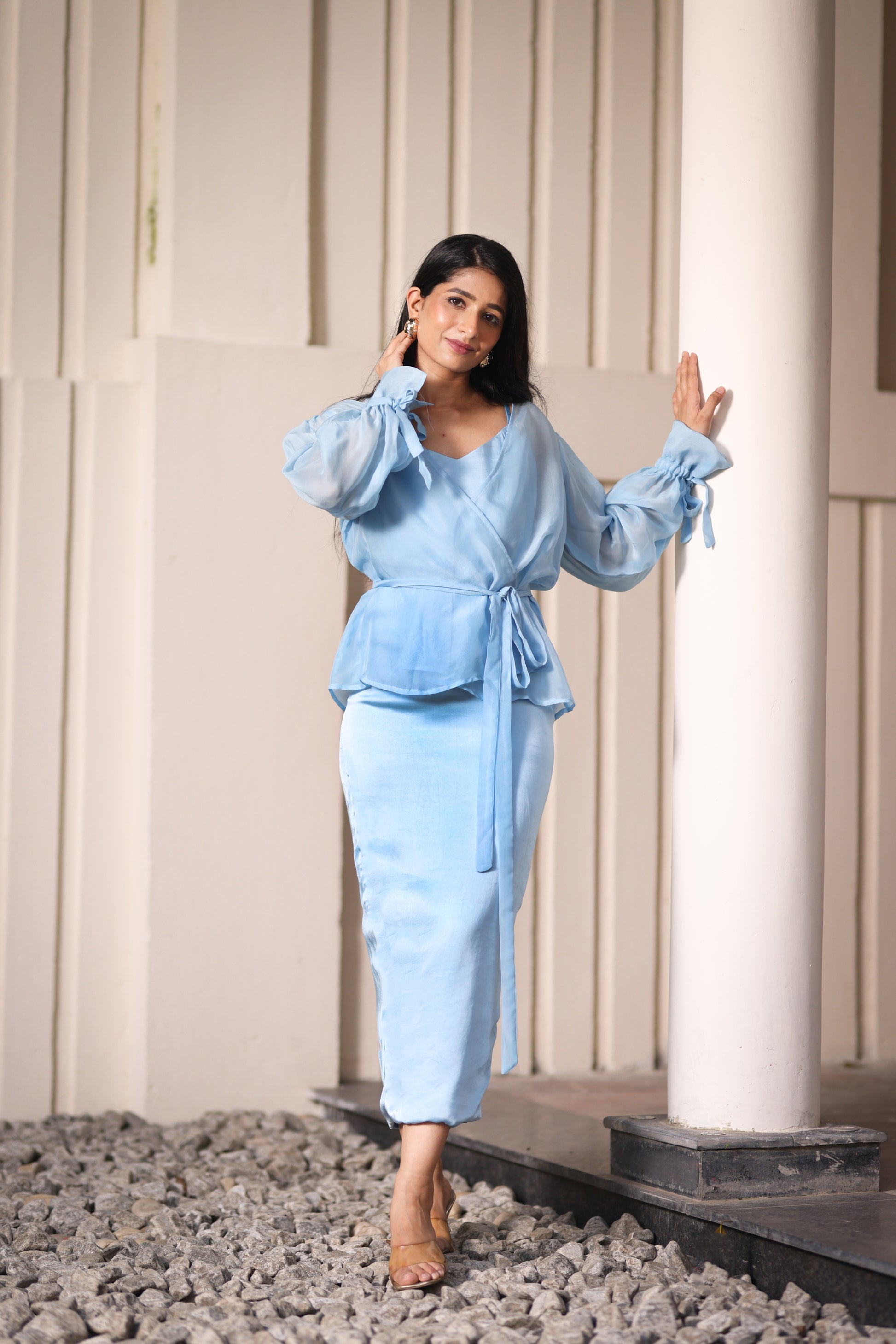 Soft, dreamy, and effortlessly graceful — the Serene Blue Organza-jacket Set brings a touch of delicate sophistication to any occasion. The wrap-style top features airy organza sleeves with gathered cuffs and a tie-waist detail that adds definition while maintaining a romantic silhouette. Paired with a sleek midi skirt in the same serene blue hue, this ensemble flows beautifully and offers an elegant, polished look perfect for brunches, formal gatherings, and evening events.