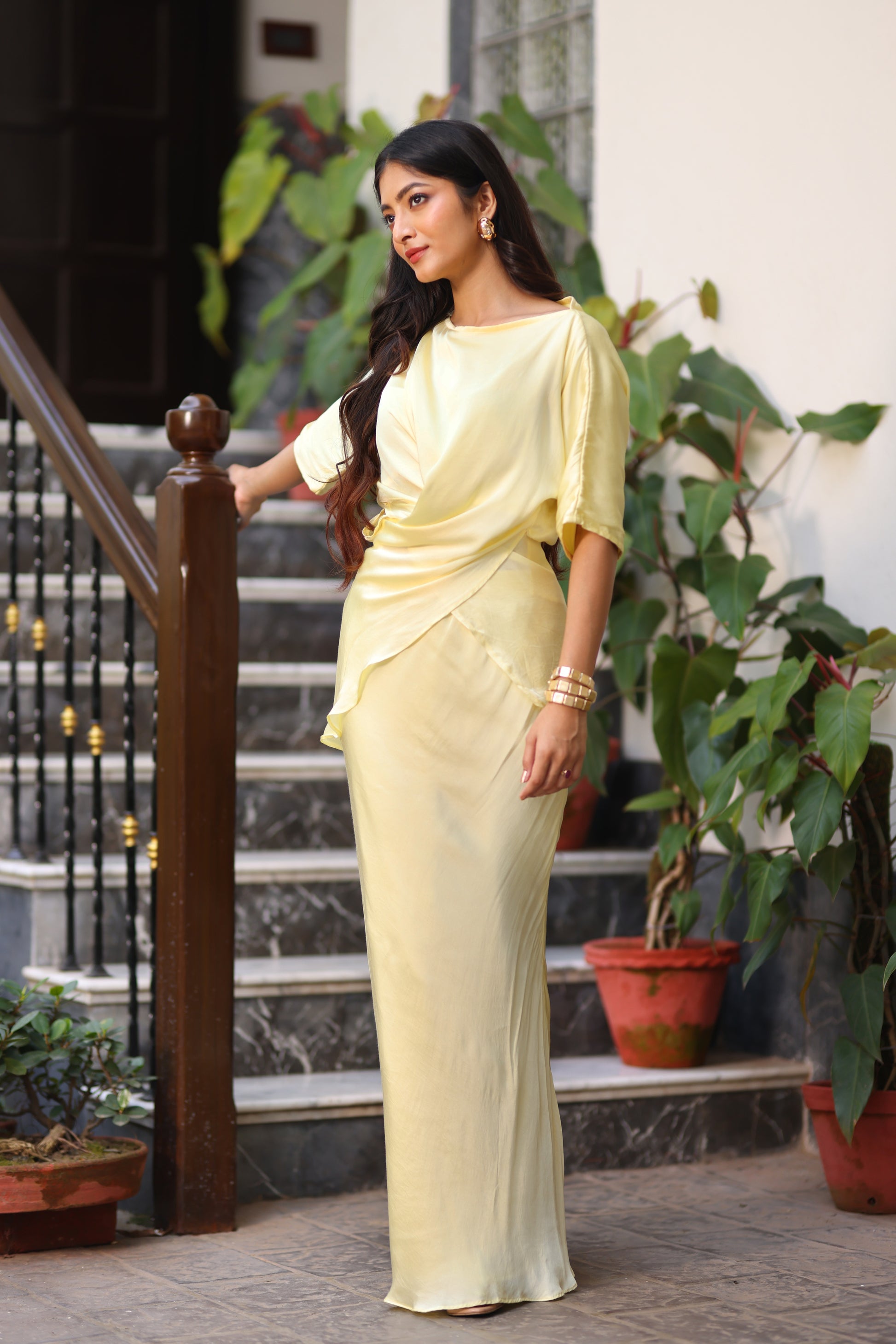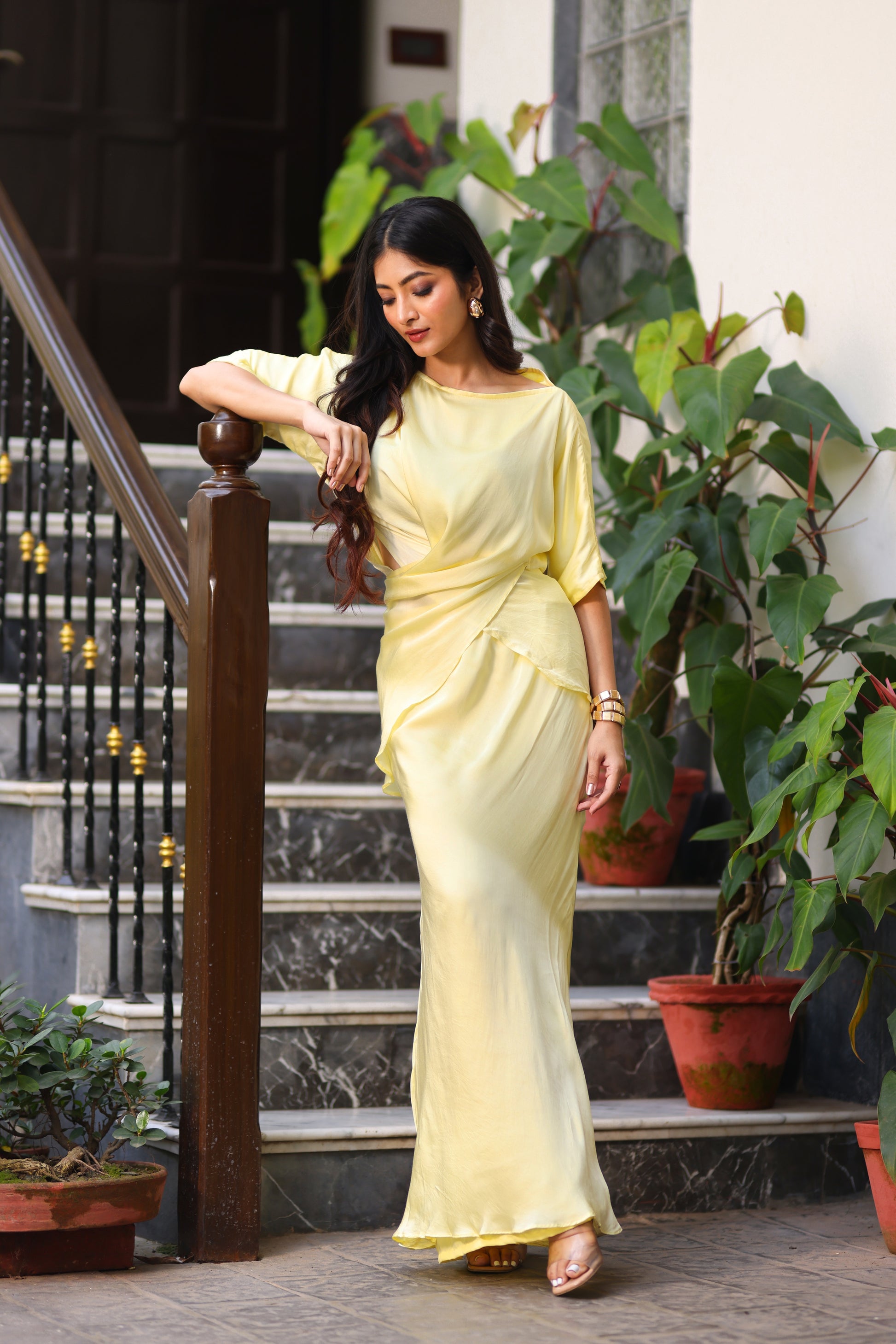 A perfect balance of softness and sophistication, the Lemon Silk Draped Gown features fluid draping that cascades gracefully along the body. Its asymmetrical silhouette, smooth finish, and subtle sheen make it a timeless choice for intimate celebrations, evening soirees, or refined festive occasions. The gentle pastel yellow creates a fresh, luminous look that flatters beautifully in natural light.